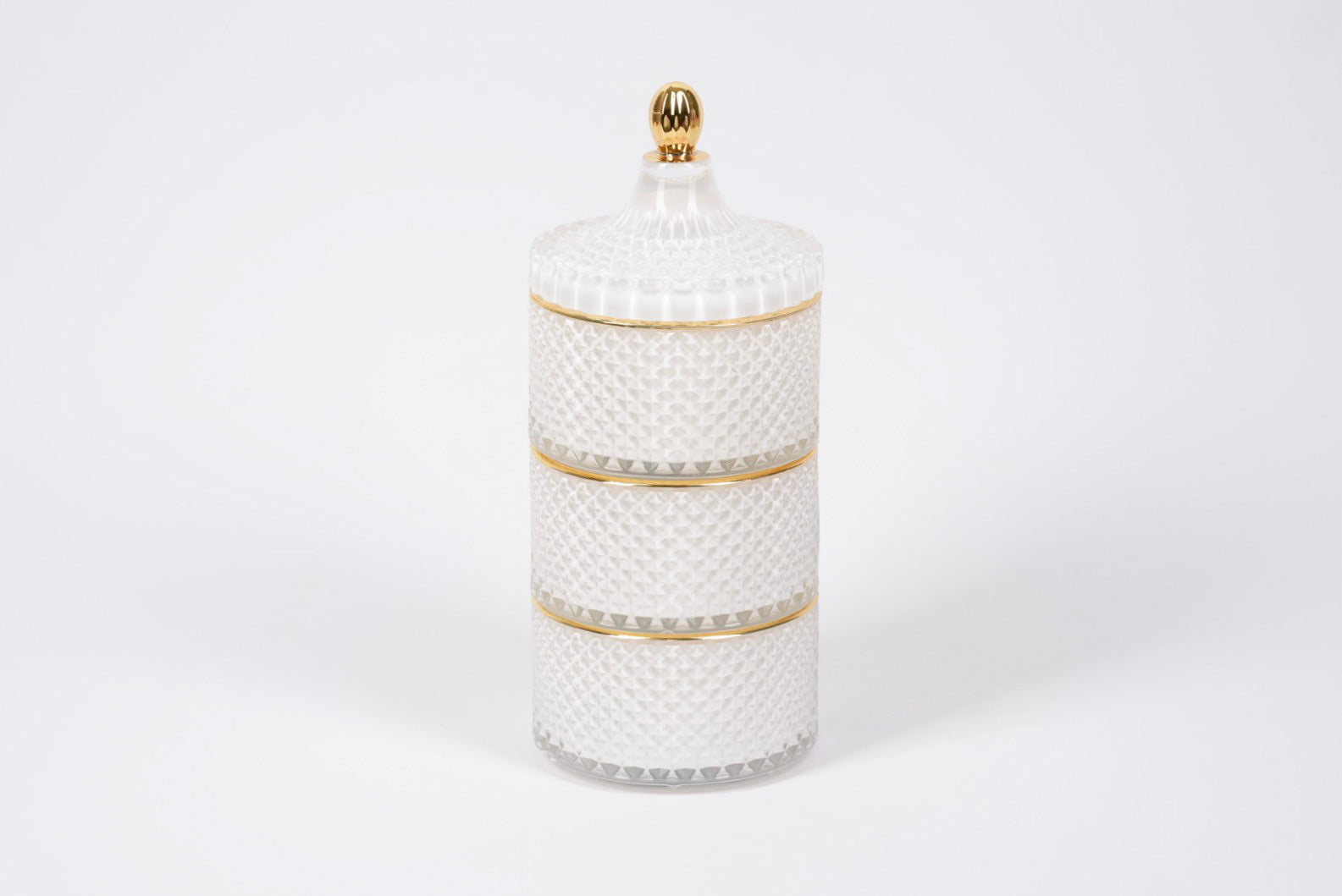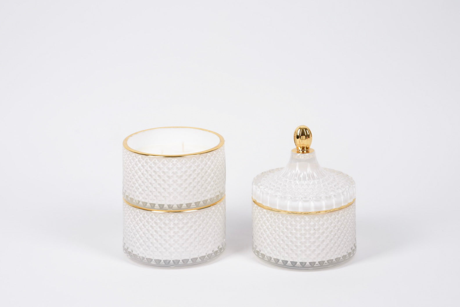 Our new crystal stackers are so glamorous, an elegant white vessel with a gold rim. Each candle holds 300ml each and are double wicked.